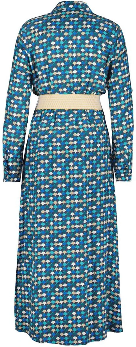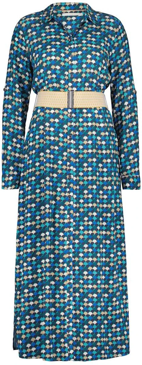 Lange jurk met lange split aan de zijkant in de Campanula blue with Sunset print. De lange mouwen hebben een biesje om de mouw ook halflang kunt dragen. Jurlk Blush heeft een klein kraagje en knoopjes aan de voorzijde. Gemaakt van 100% Viscose. De bijgevoegde riem maakt deze jurk helemaal af!