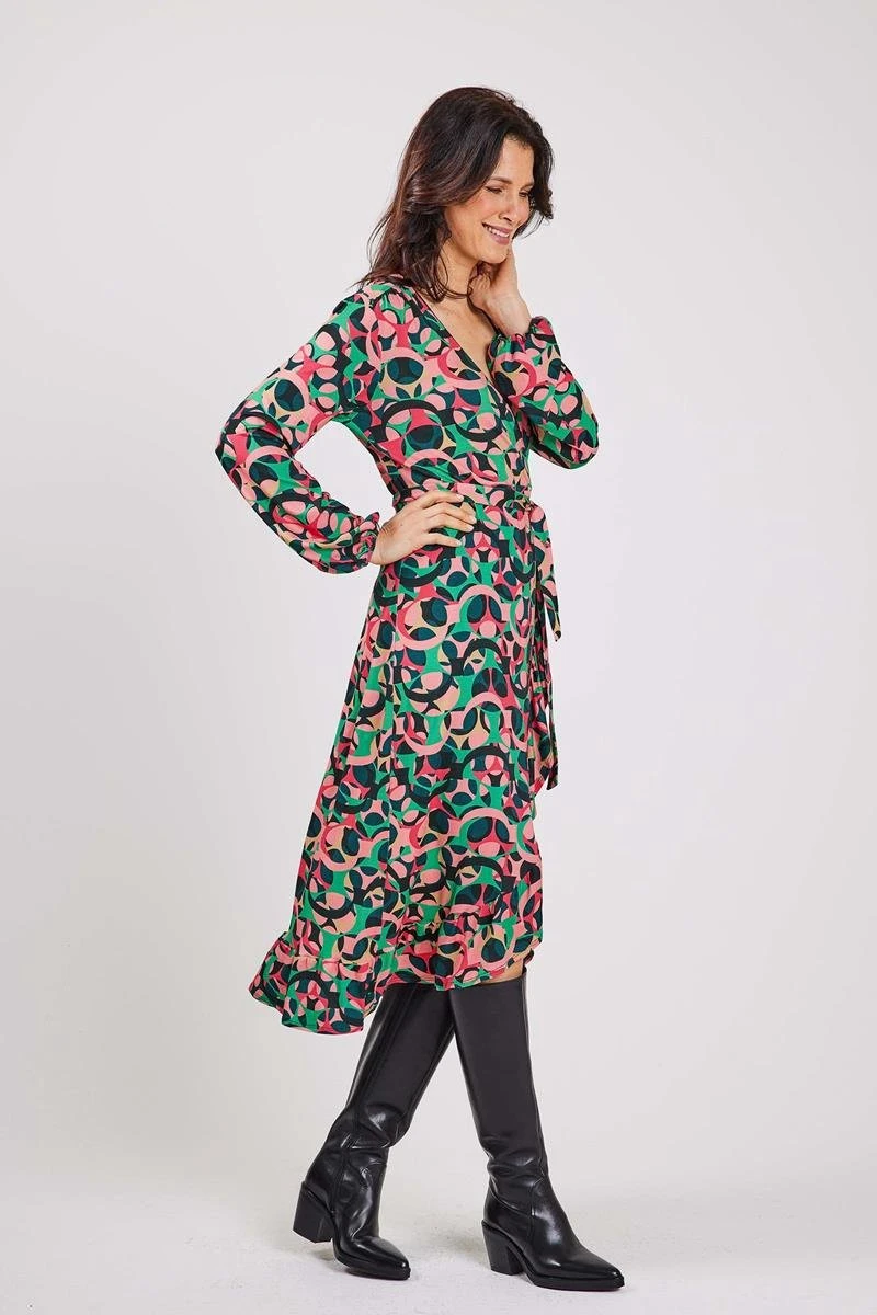 Jersey dress Jiva in Pink with Circle of Life print is een heerlijke jersey jurk met een makkelijke pasvorm door de wikkelsluiting. Jurk Jiva is aan de voorzijde afgezet met een ruche, de lange mouwen hebben een iets poffend effect. Gemaakt van Viscose.