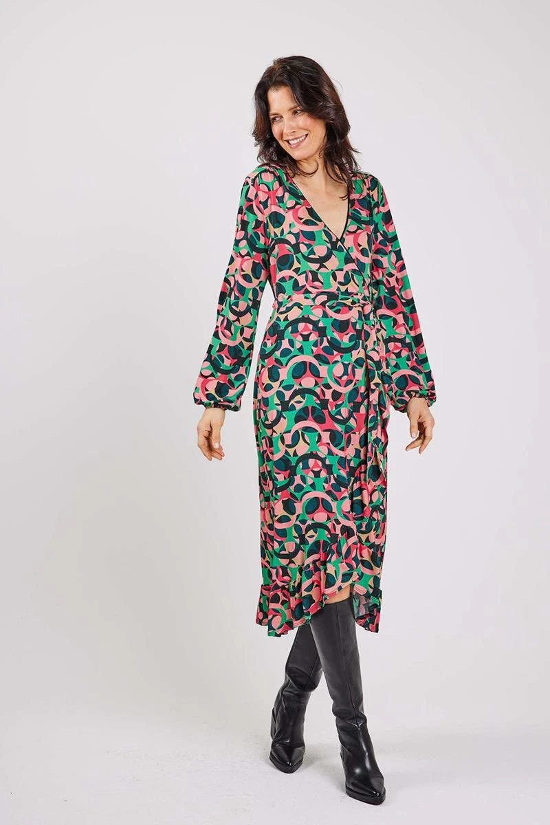 Jersey dress Jiva in Pink with Circle of Life print is een heerlijke jersey jurk met een makkelijke pasvorm door de wikkelsluiting. Jurk Jiva is aan de voorzijde afgezet met een ruche, de lange mouwen hebben een iets poffend effect. Gemaakt van Viscose.