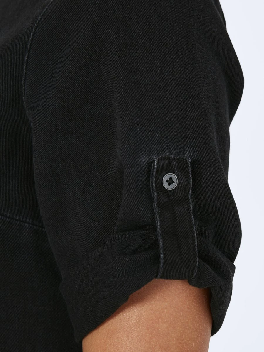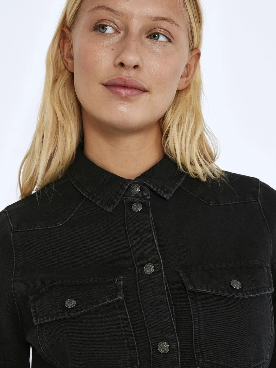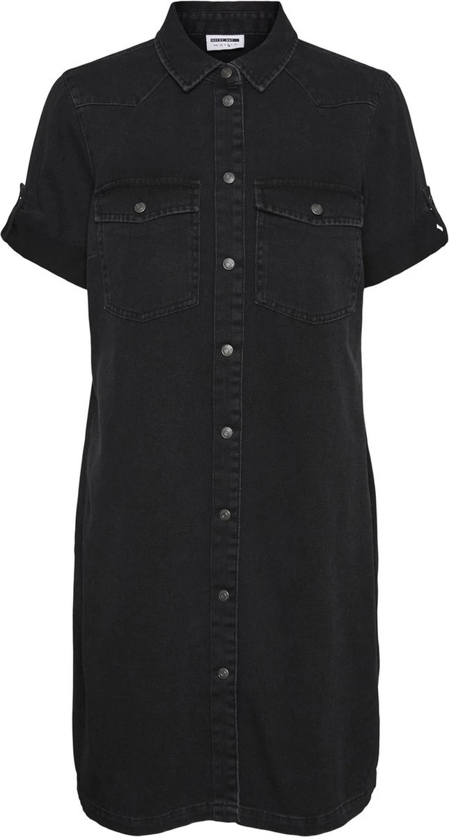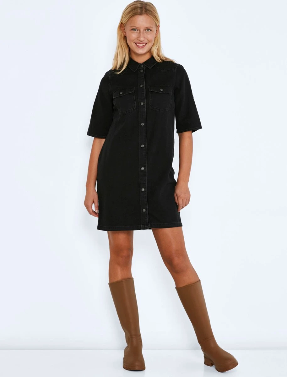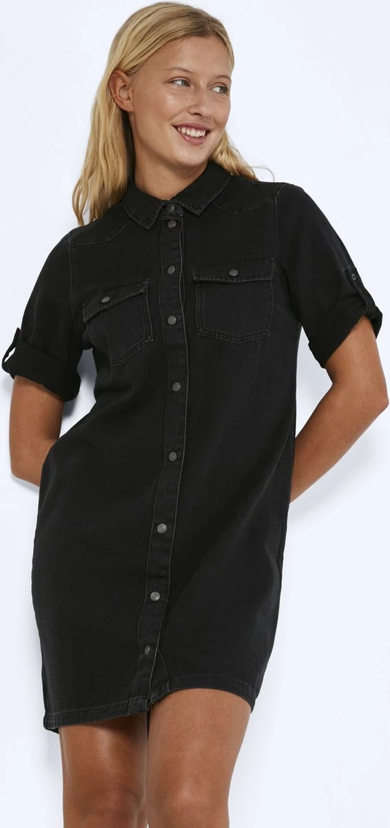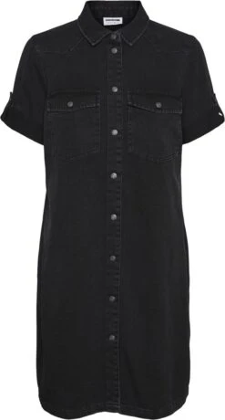 Denim jurk van het merk Noisy May. Het jurkje met korte mouwen is zwart en heeft een knoopsluiting. Daarnaast heeft het een kraag en twee borstzakken. Het artikel is gemaakt van 100% katoen.