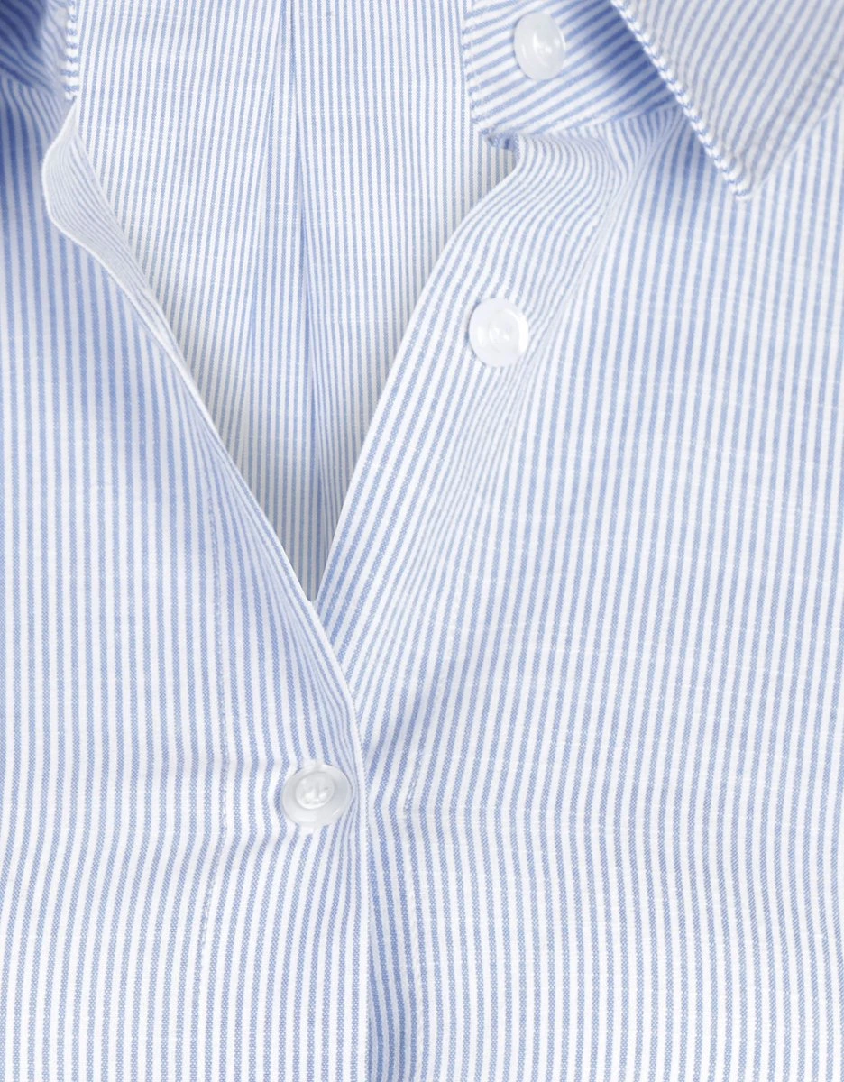 | Model | Deze overhemdjurk heeft lange mouwen en een puntkraag. De jurk is gemaakt van een fijne zomerse katoenmix. De manchetten hebben een twee knoopsluiting. De jurk is inclusief riem van hetzelfde |