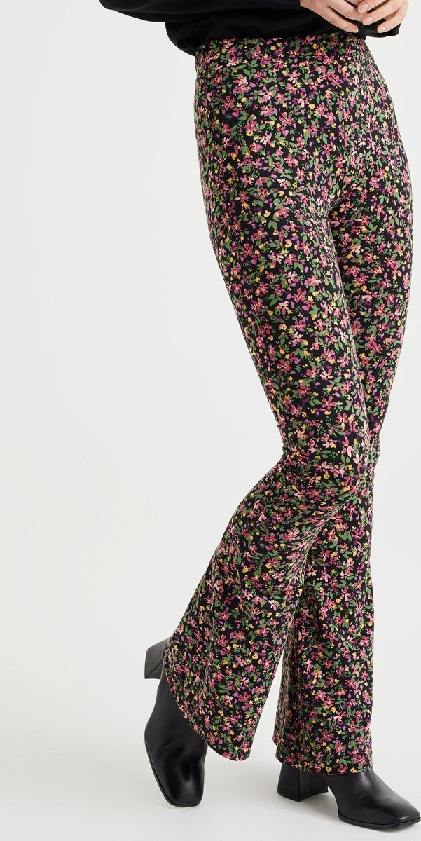Een regular fit legging van jersey-kwaliteit met een dessin. Het model heeft wijduitlopende pijpen.