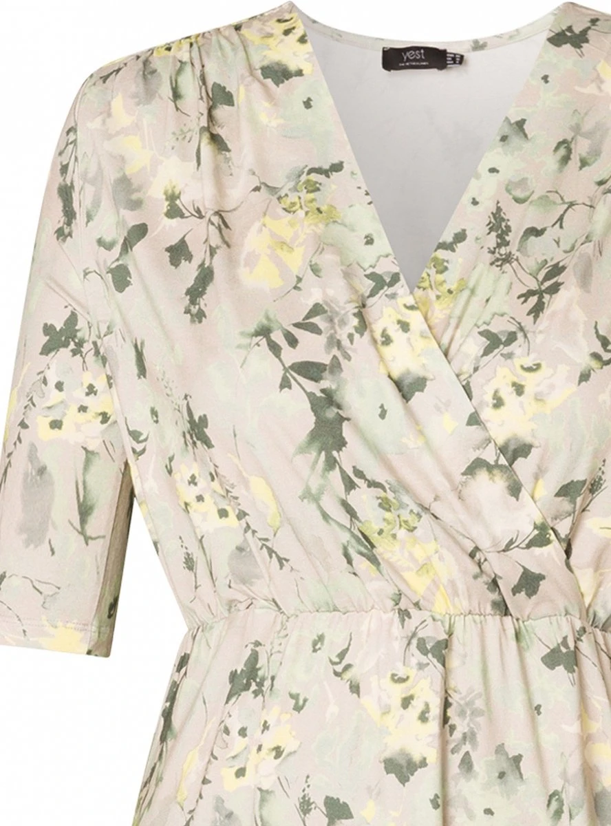 Midi-lange jurk van Yest met een all-overprint. Door de overslag en het elastiek ligt de focus mooi op de taille. Korte mouwen en op de schouderpas kleine plooitjes.